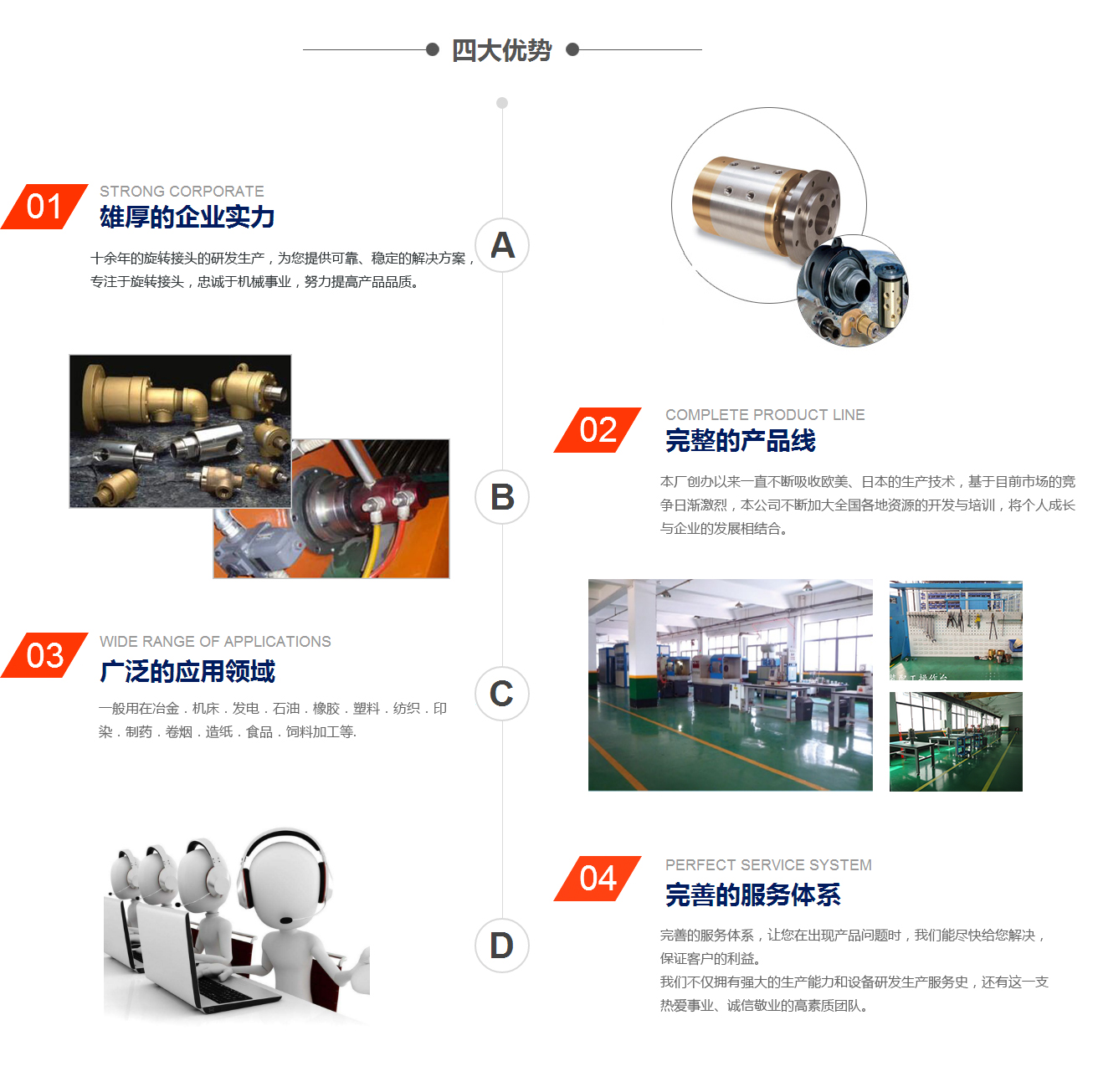 旋轉接頭是把流體介質從靜止的管道輸入到旋轉或往復運動的設備中去的連接密封裝置,它是一個獨立的單體產品,一端與靜止的管道連接,另一端與運動的設備連接,介質從中間通過。該產品采用機械密封,不需填料,可以自動同心,自動補償,摩擦系數小,使用壽命長。